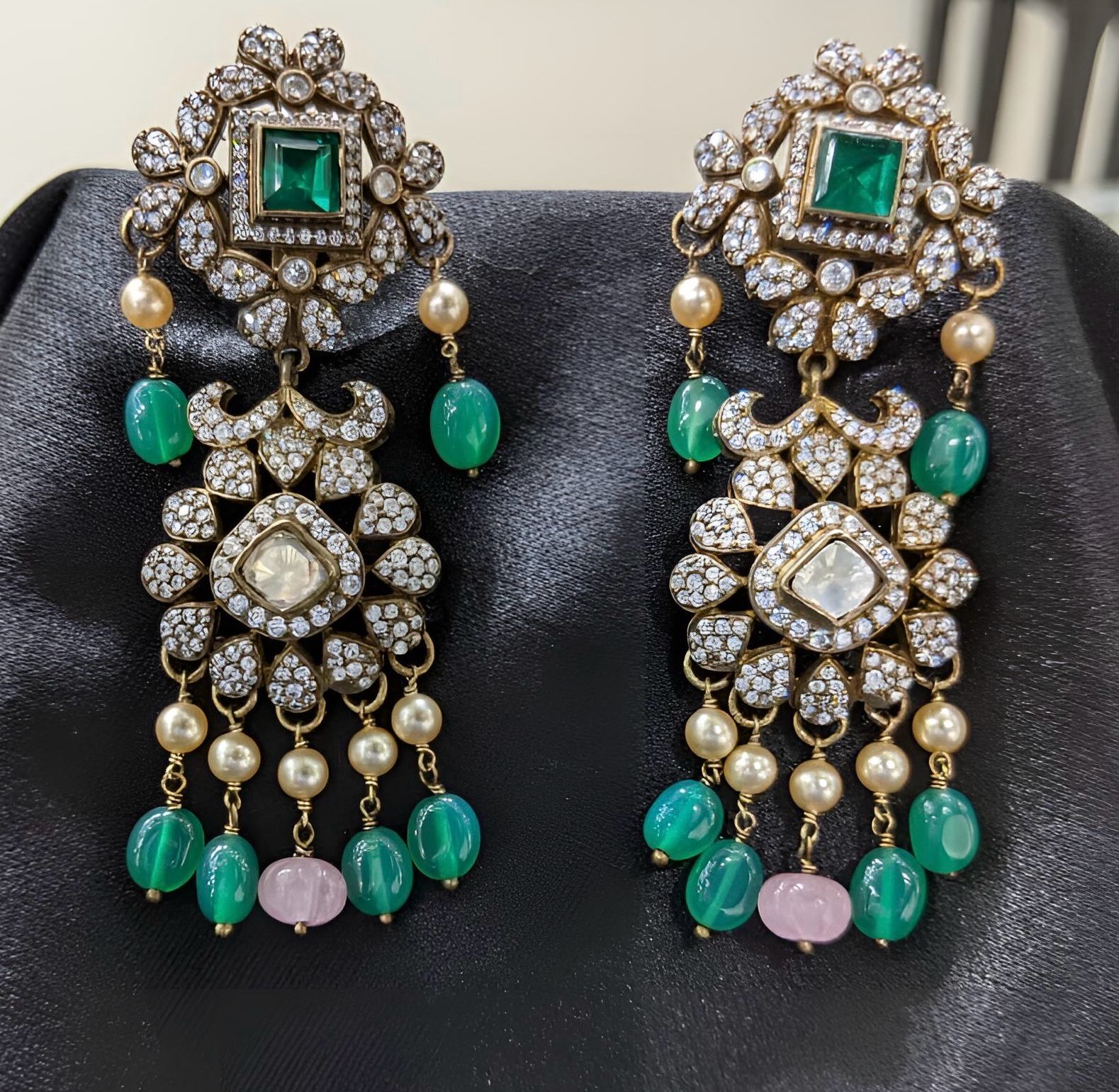 Exquisite long earrings with emerald studs, floral polki motifs, and cascading pearl, green, and pink bead danglers — a graceful blend of color and sparkle.