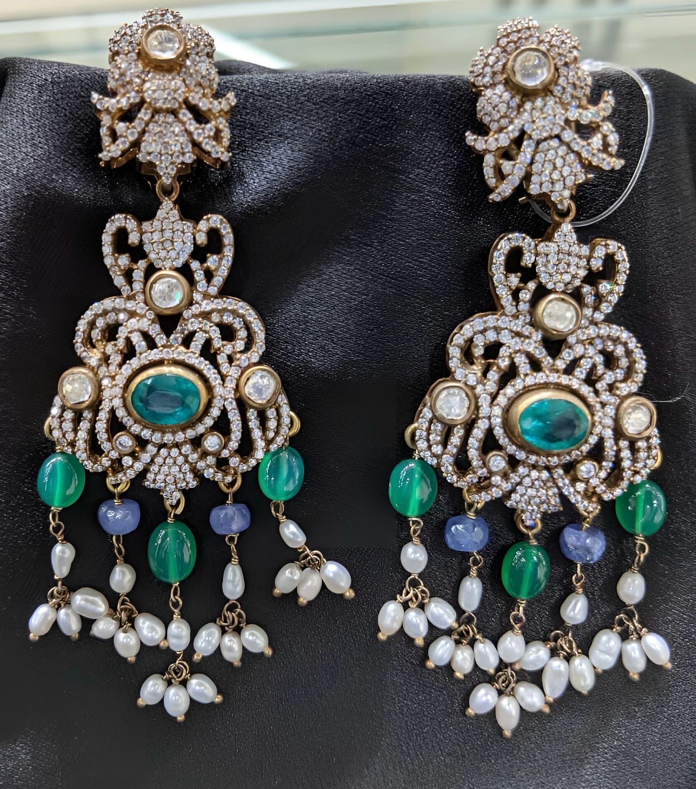 Majestic long earrings adorned with a central emerald stone, intricate diamond-studded patterns, and finished with green, blue beads and pearl danglers — perfect for a royal occasion.