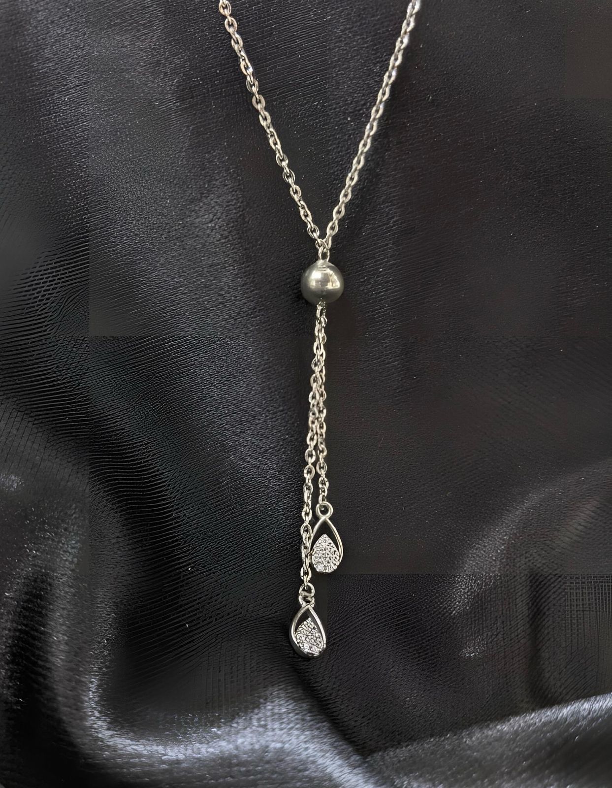 This sleek silver necklace features a sliding bead design with dual teardrop-shaped pendants embellished with shimmering stones — minimal, elegant, and versatile for any look.