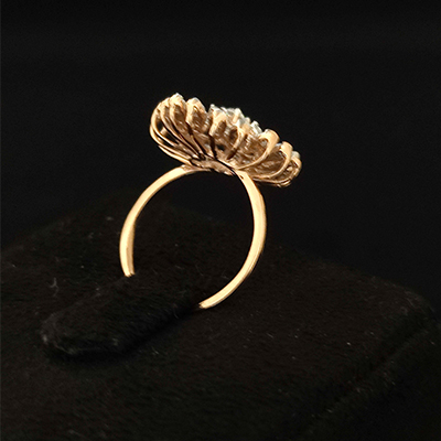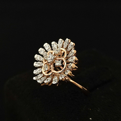 This moissanite ring stuns with its intricate floral-inspired design, featuring a radiant burst of sparkling stones. The rose gold framework adds warmth, making it a standout piece.